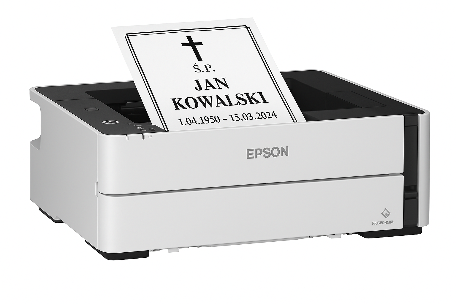 Oferujemy gotową do pracy drukarkę sublimacyjną Epson M1170, przystosowaną do profesjonalnego druku tabliczek pogrzebowych na papierze sublimacyjnym. To sprawdzone rozwiązanie dla zakładów pogrzebowych, które cenią szybkość, trwałość i jakość wykonania.