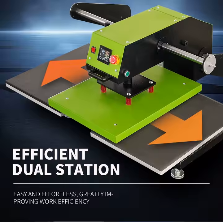 Prasa termosublimacyjna FZLC-B2 to wysokiej klasy, półautomatyczne urządzenie pneumatyczne z dużą powierzchnią roboczą 40 × 60 cm. Dzięki swojej konstrukcji i funkcji podwójnego stołu roboczego doskonale sprawdza się przy produkcji tabliczek pogrzebowych, nadruków na odzieży i innych płaskich produktach sublimacyjnych.